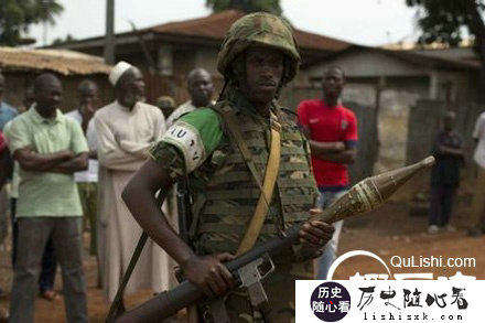 2014年3月23日,中非共和国首都班吉,一名非洲联盟的士兵正在一个举行葬礼的家庭外站岗。葬礼中的两个人是在穆斯林街区中被教派暴力分子杀害的。为防止基督教徒与穆斯林之间的教派冲突上升为种族灭绝,联合国安理会一致投票决定派遣维和部队前往中非共和国维持稳定。
