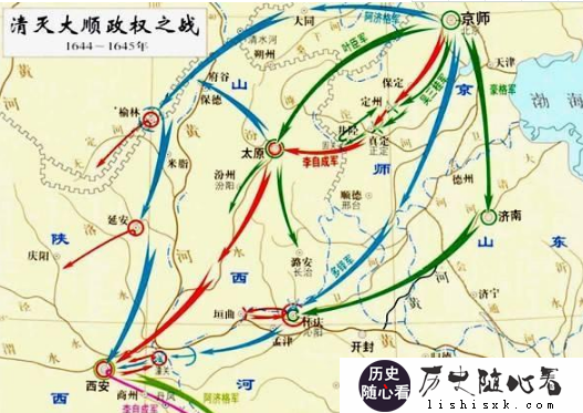 1644年3月,李自成率军寇京师,顺军所向披靡,京师附近各驻军纷纷投降。3月19日,京师陷落。此时大顺占据河南、河北、陕西、山西、山东五省,又经营宁夏、甘肃、青海、湖北、安徽、江苏一部分。拥兵百万,战将无数,成为当时最强大的一方势力。